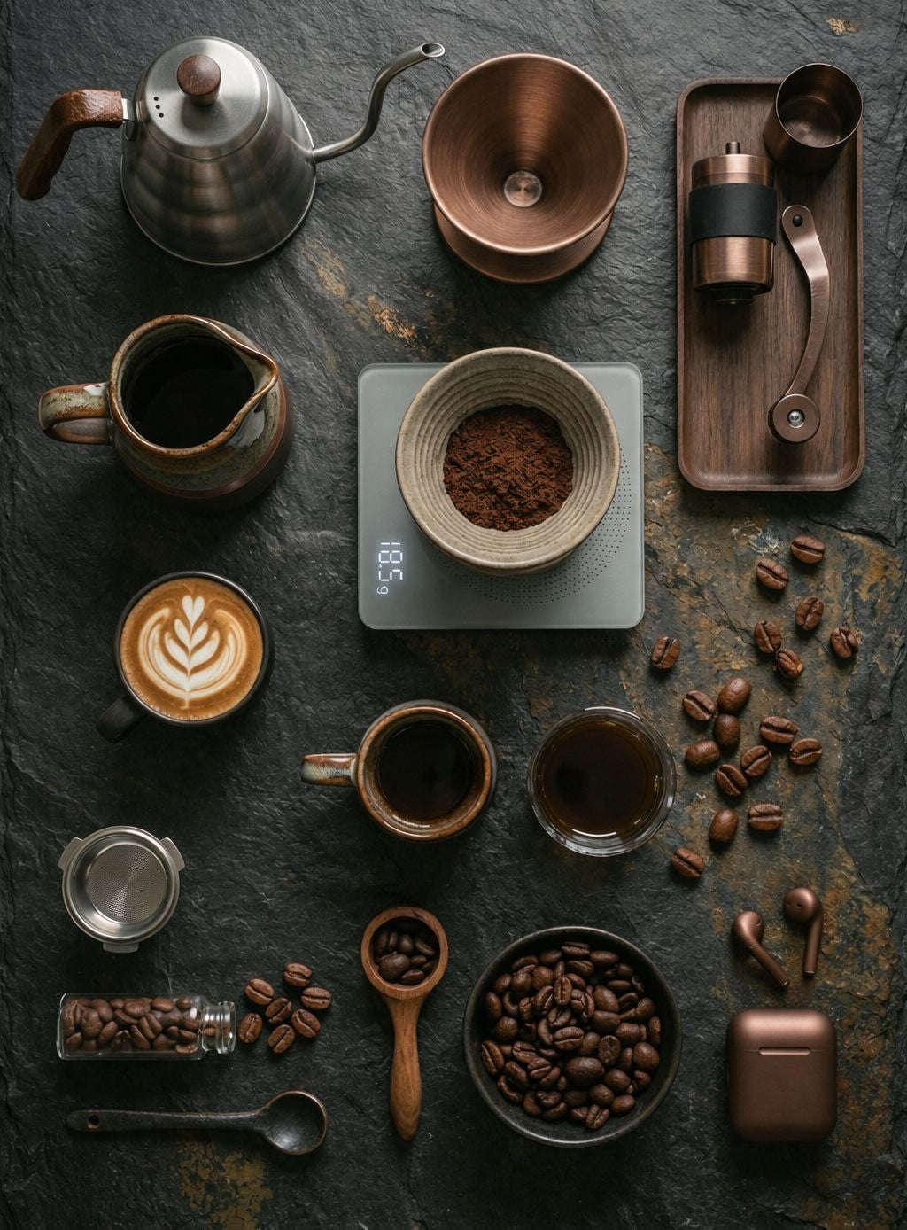 A complete set of manual equipment for coffee brewing. Experience control over your ground coffee extraction. Just add water and your chosen beans